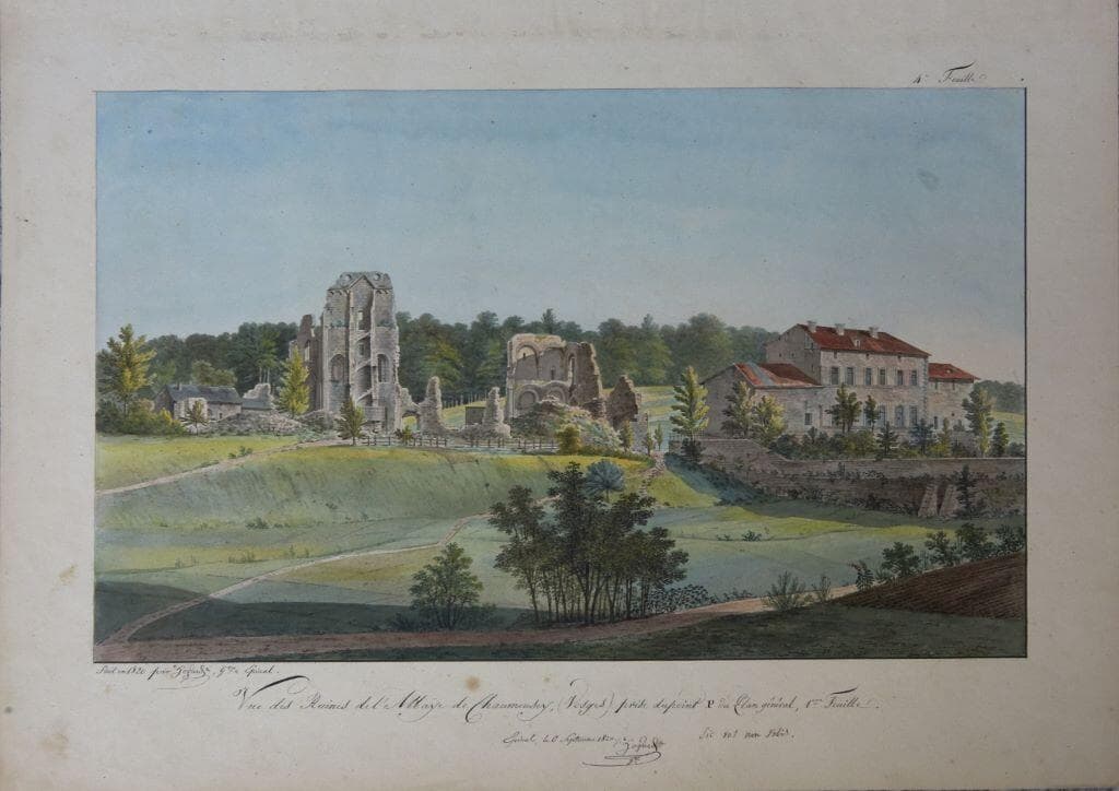Vue des ruines de l’abbaye de Chaumousey (Vosges) prise du point P du plan général