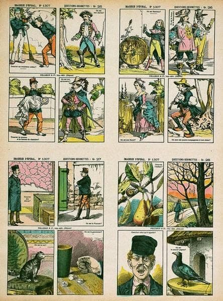 Mêmes vignettes que dans le Gr. 2 (2 vignettes) de la planche de devinettes n°1301 (coll. MUDAAC, dépôt au MIE D 996.1.1274 B), dans le Gr. 17 (1 vignette) et dans le Gr. 19 (2 vignettes) de la planche de devinettes n° 1305 (coll. MUDAAC, dépôt au MIE D 996.1.1281 B), dans le Gr. 21 (3 vignettes), Gr. 23 (2 vignettes) et Gr. 24 (2 vignettes) de la planche de devinettes N°1306 (coll. MUDAAC, dépôt au MIE D 996.1.1282 B) imprimées par Pellerin & Cie à Épinal.