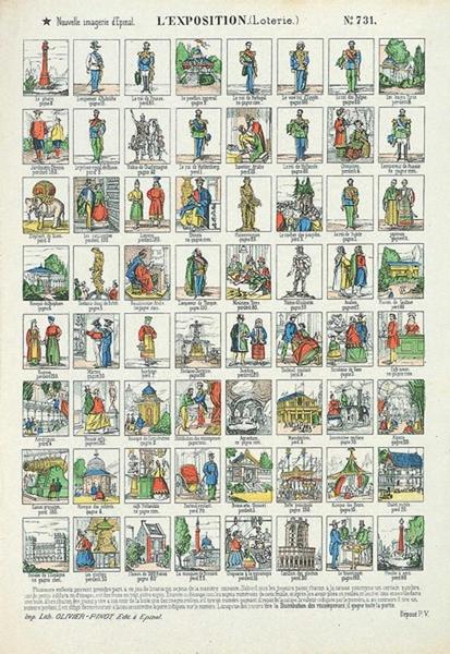 représentation d'objet (loterie, exposition universelle, époque 19e siècle : Second Empire, phare, fond de paysage : pont, ville, François Joseph Ier de Habsbourg-Lorraine : empereur d'Autriche : en pied, Guillaume Ier d'Allemagne : roi de Prusse, pavillon d'exposition : empereur de France, drapeau, Louis Ier de Portugal : roi du Portugal, Ismaïl Pacha : chef d'état d'Egypte, Léopold II de Belgique : roi de Belgique, hammam, jardinier : Chinois, pelle, jardin, Frédéric III d’Allemagne : prince héritier : Prusse, statue : Charlemagne : à cheval, soldat, Charles Ier de Wurtemberg : roi de Würtemberg, savetier : assis, chaussure, vue d’intérieur, Guillaume III d'Orange-Nassau : roi de Hollande : stathouder de Hollande, femme : Asiatique, bourgeoisie, plateau, verre, éventail, Alexandre II de Russie : empereur de Russie, éléphant : Siam : Asie hist, visite, catacombes, Lapon, moisson, blé, foule, rocher, arbre, Charles XV de Suède : roi de Suède, Japonais, kiosque : Bosphore, groupe : à mi-corps, ange, Arabe, fabrication : bouchon, couteau, Abdulaziz : sultan ottoman : chef d'état de Turquie, musicien : Turc, banjo, instrument à cordes, tambourin, cruche, verre à pied, Ambiorix, chef militaire : gaulois, maison, Russe, marin, de dos, conversation, Suédois, fontaine, siège roulant, soldat, enfant, étagère, vase : porcelaine, serveur, comptoir, plateau, foule, bâtiment : Amérique, plante, tenture, tableau, kiosque : impératrice, remise : récompense, spectateur, aquarium, grotte, bassin, bâtiment : industrie, locomotive : route, Algérie, canon : Prussien, colibri, débit de boisson : Hollandais, bâtiment : beaux-arts, porte, bannière, chalet, Espagne, cloche, mosquée : Brousse, ouvrier, machine, fabrication : chapeau, carillon, tourniquet, tour, moulin à vent)