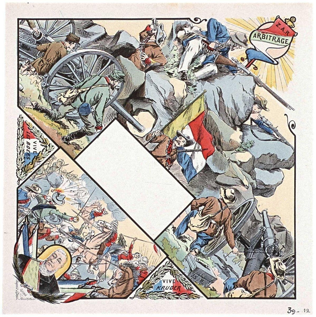 scènes (guerre : Boer, groupe : homme, fusil, canon, jumelles, drapeau, rocher, bataille, soldat, Angleterre, à cheval, lance, explosion, Troisième République) ; portrait (Krüger Paul : président de la République sud-africaine du Transvaal, en buste, drapeau) ; ornementation (bannière, Boer, rayons lumineux, rameau : laurier)