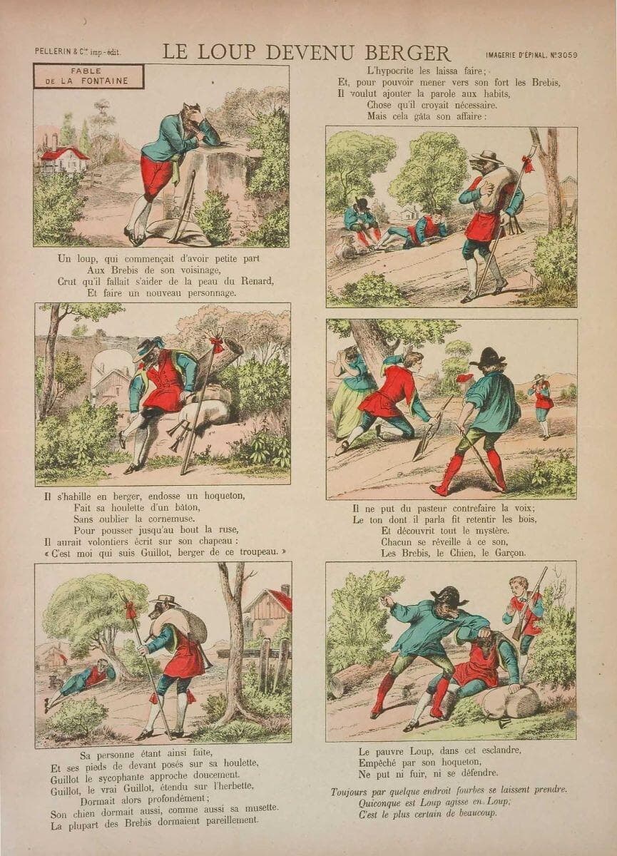 même image que Pellerin FABLES DE LA FONTAINE. LE LION ET L'ÂNE CHASSANT. / LE LOUP DEVENU BERGER. n° 49 (avant 1866 et entre 1866 et 1870) ; image publiée dans " Album n°2 de cent images d'Epinal composé spécialement pour fillettes " (D 996.1.18587.94 Alb)