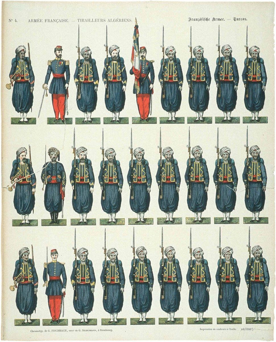 groupe de figures (accumulation, homme, en pied, soldat, armée, France, uniforme, turco, tirailleur : Algérien, officier, tambour, sabre, fusil, baïonnette, drapeau : Français, époque 19e siècle : Troisième République)
