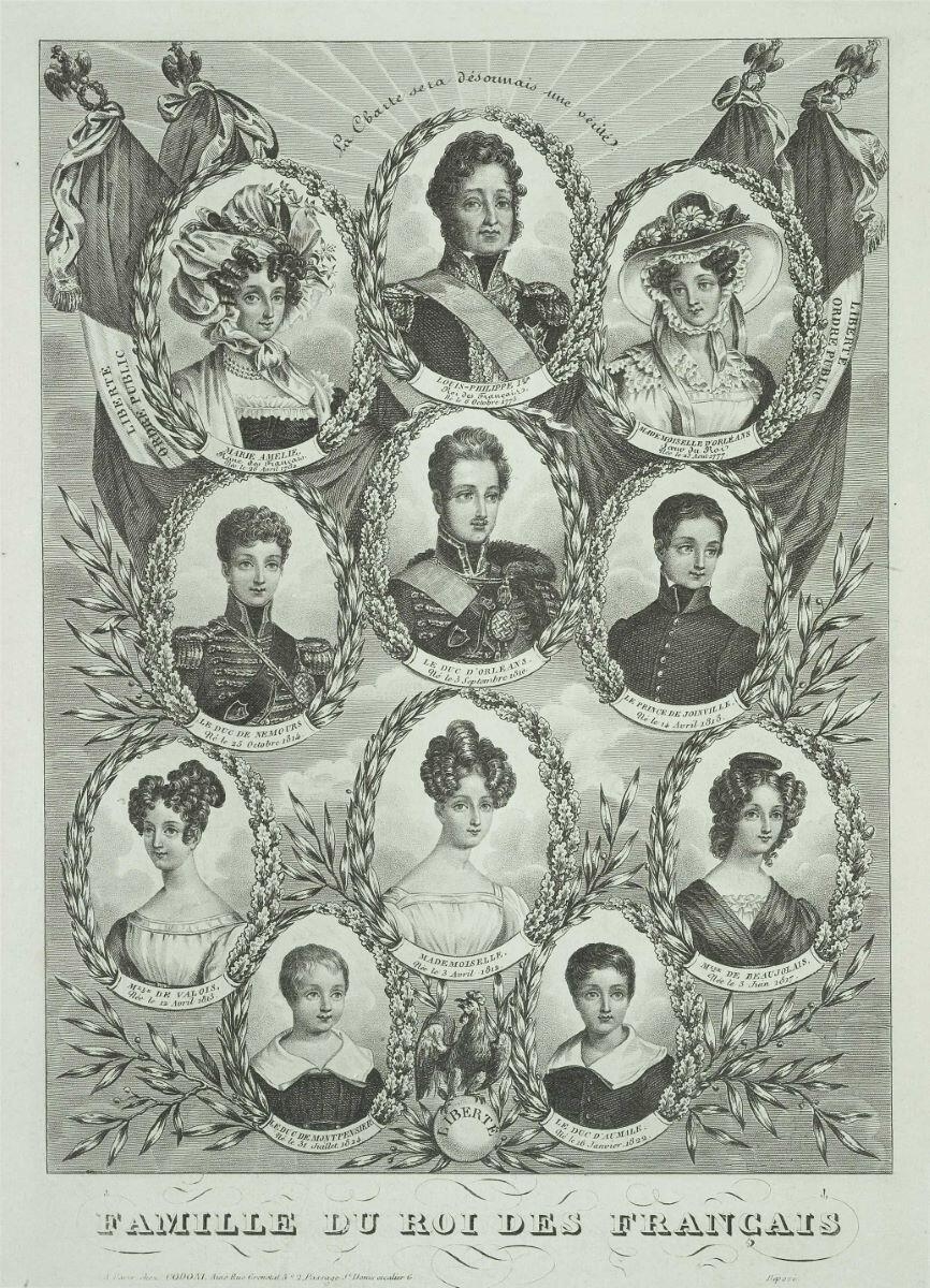 portrait collectif (Orléans famille d', en médaillon, en buste, Louis-Philippe Ier, roi de France, Bourbon-Orléans, Bourbon Louise Marie Amélie Thérèse de : reine de France, Orléans Adélaïde d', Orléans Louis Charles Philippe d' : Nemours duc de, Orléans Ferdinand Philippe Louis d' : Orléans duc d', Orléans François Ferdinand d' : Joinville prince de, Orléans Marie Clémentine Caroline d', Orléans Marie Caroline Adélaïde d', Orléans Louise Marie Adélaïde d', Orléans Antoine Marie Philippe Louis d' : Montpensier duc de, Orléans Adélaïde d', Orléans Henri Eugène Philippe d' : Aumale duc d', prince, princesse, époque 19e siècle : Monarchie de juillet, ornementation, drapeau : France, coq)