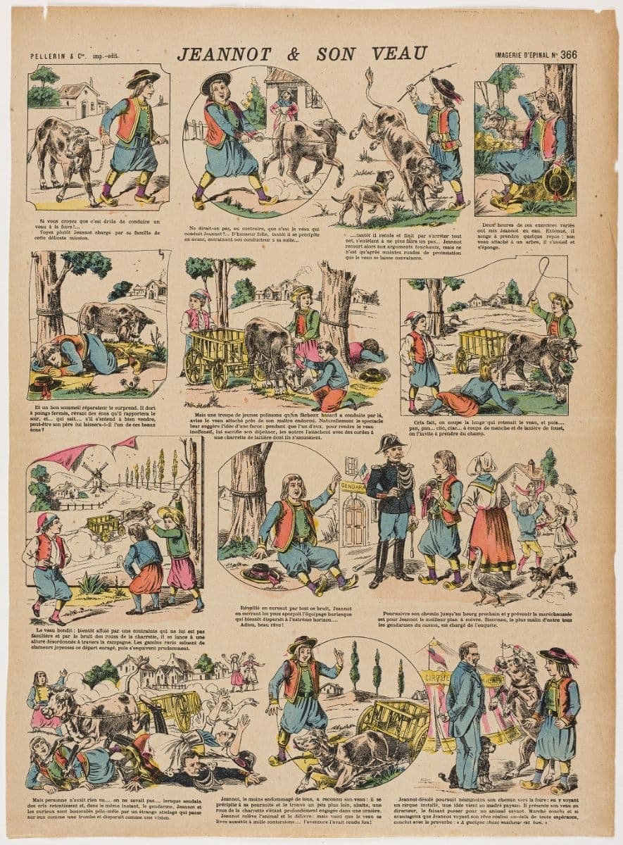 scènes (cycle narratif, jeune homme, costume traditionnel : Breton, sabot, paysan, la marche, veau, désobéissance, chien, veau, corde, sommeil, voiture à attelage, enfant, farce, fouet, peur, course, jeune homme, lever, homme, gendarmerie, conversation, village, femme, groupe, chute, couché, folie, cirque)
