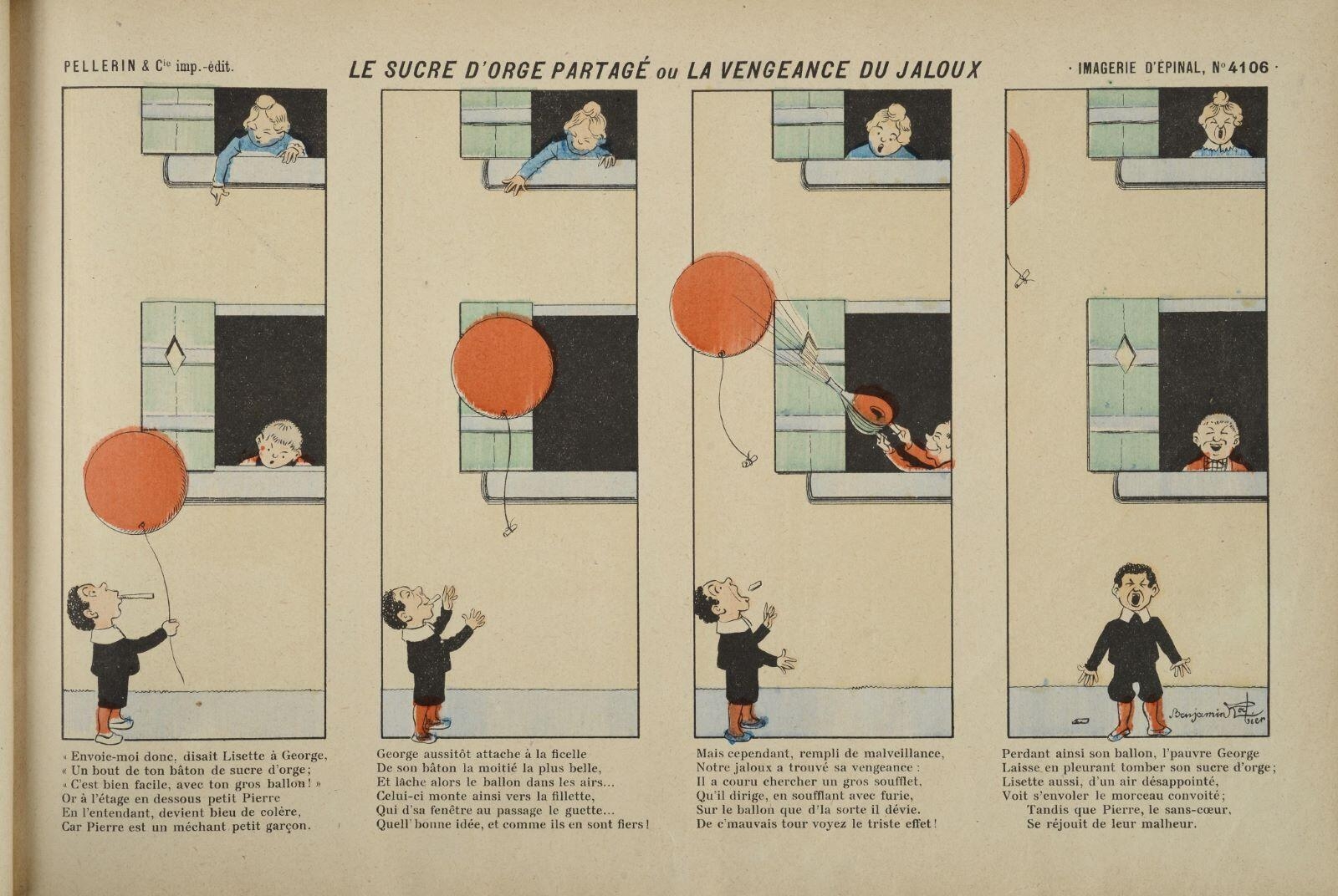 suite de scènes (cycle narratif : comique, garçon, préhension, ballon de baudruche, confiserie, fille, penché, fenêtre, désigner, en vol, soufflet, aller, tristesse, confiserie : chute)