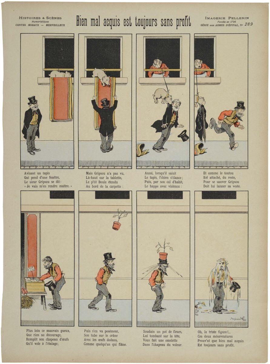 suite de scènes (cycle narratif ; homme : voleur, préhension, vol : tapis, chien, chute, morsure : veste, captif, laisse, fuite, femme, penché, fenêtre ; vol, oeuf, caisse, chapeau, pot : plante, briser : oeuf, tête)