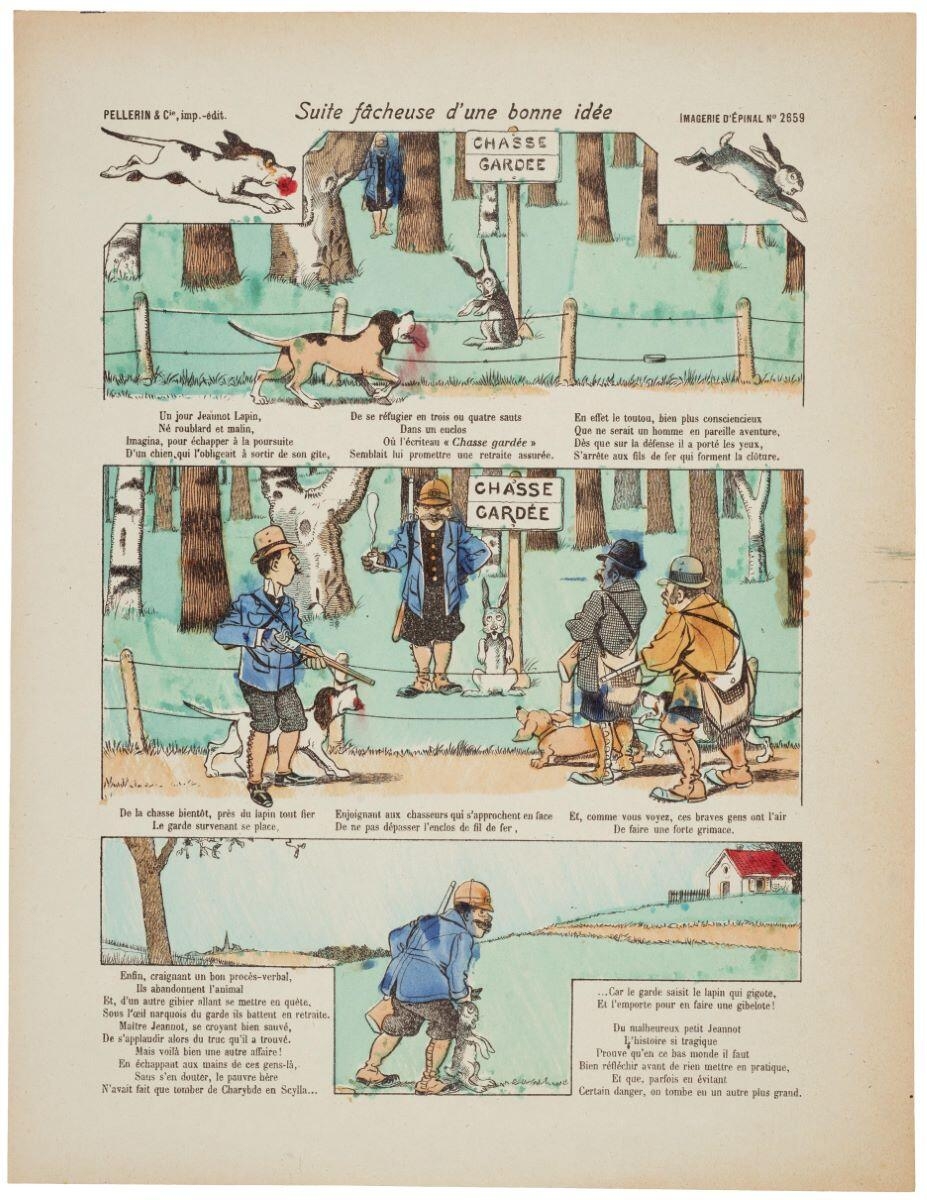 suite de scènes (cycle narratif : comique, forêt, chien, poursuite, lapin, fuite, désigner, clôture, pancarte, garde-chasse, arrivée, pipe, conversation, groupe : homme, chasseur, la chasse, fusil, sacoche, observation, préhension, oreille, aller, chemin, barrière, maison)