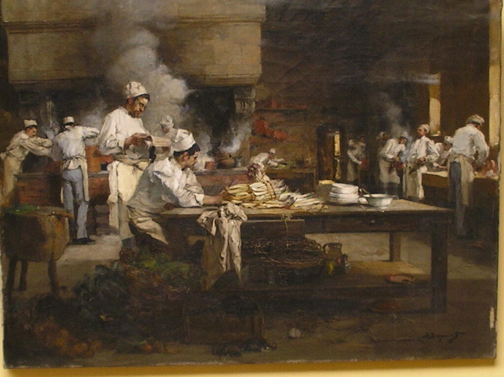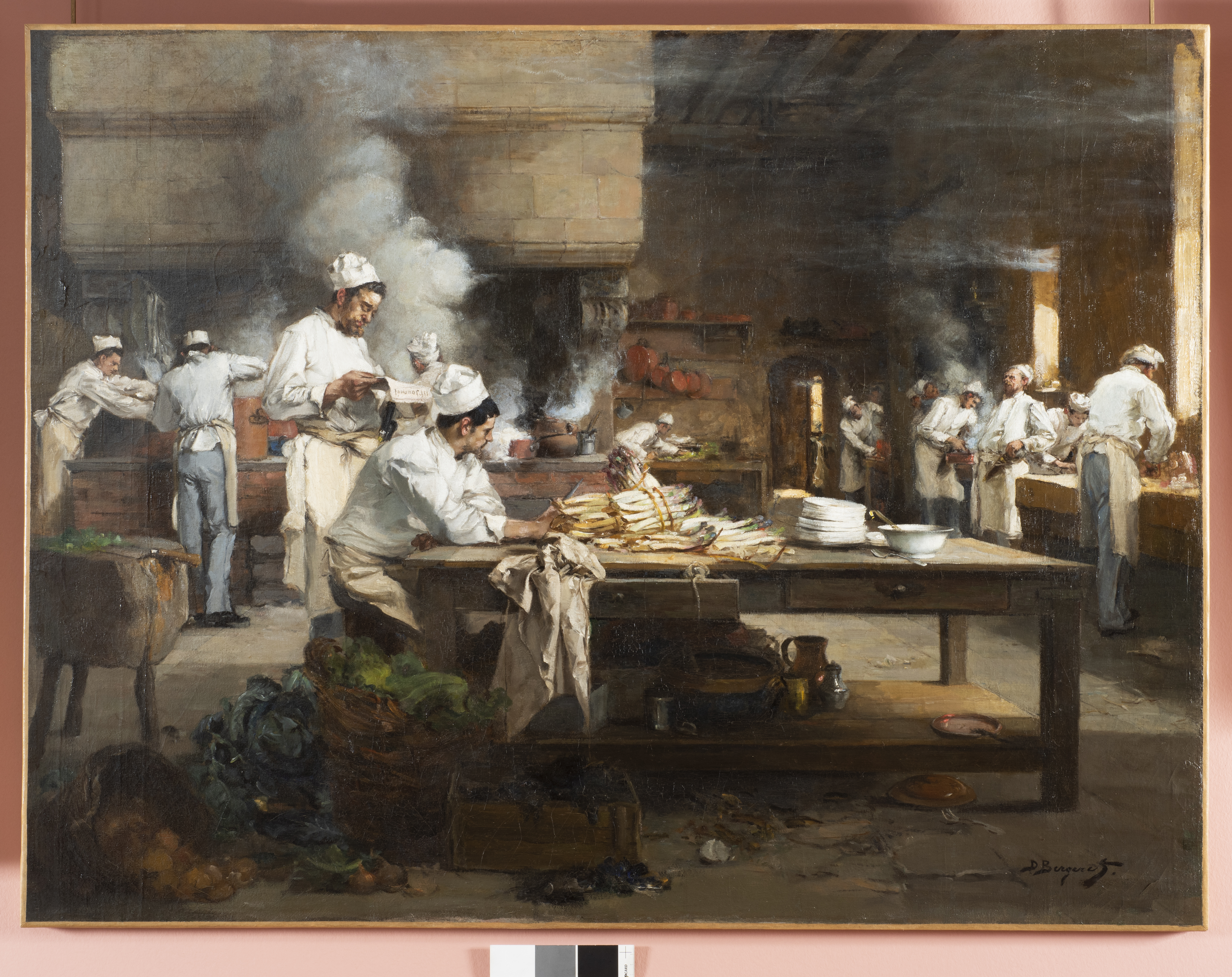 scène de vie quotidienne (cuisine, cuisinier, apprenti, journal, table, asperge, cuivre, cheminée)