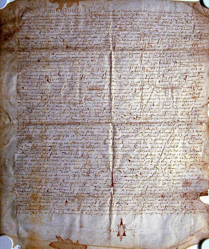 texte en latin au contenu illisible évoquant le monastère des Feuillants dans la seigneurie de Beaufort en 1518 : De l'an 1518 / Bait arrêt par l'abbé [et] / et [prieux ?] et sindic et autres / Moines des feuillans a [cayse ?] / dans la seigneurie de Beaufort / Cet acte ne m'a pas esté / remis par monsieur de Cironis (g. verso, écrit à la plume) ; don au Musée des Toulousains / 6 avril 1930 / Marius Ollier ; 6 F (b. m. verso, plume)