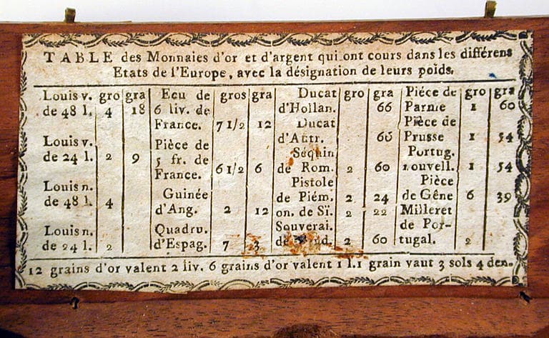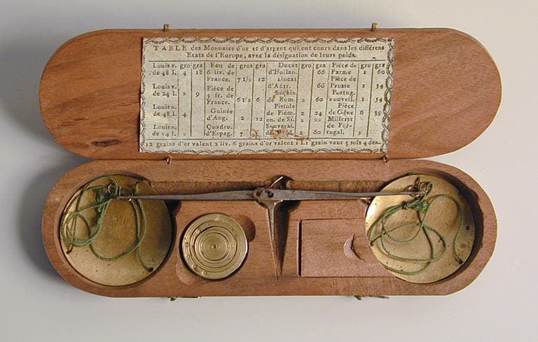Collection H. Rachou, Artiste Peintre, mon père / Balance de bijoutier ou de changeur A Micheline Escala avec mes affectueuses pensées. Juin 1968 ; IMAR RACHOU (étiquette libre) ; table des monnaies d'or et d'argent ayant cours dans différents états de l'Europe, avec la désignation de leurs poids (étiquette collée à l'intérieur du couvercle de la boîte)