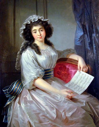 portrait (femme, Guignon Marie-Thérèse-Eléonore (Lescot Mlle, Maniban marquise de) ; de trois-quarts ; assis ; robe ; coiffe ; ceinture (rayure) ; partition ; chanteur)