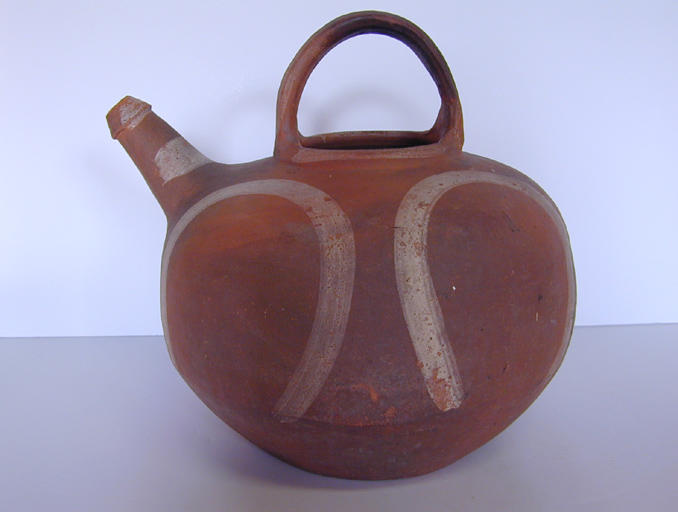 Cruche avec goulot, anse en panier, décors d'engobe de 4 fers à cheval sur la panse, sur le goulot et l'anse