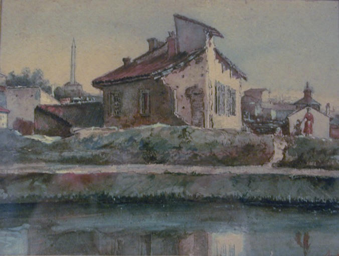 paysage (canal, Toulouse, maison, colonne commémorative, chemin : halage, groupe de figures)
