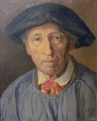 portrait (homme, en buste, de face, costume traditionnel, blouse, béret, foulard)