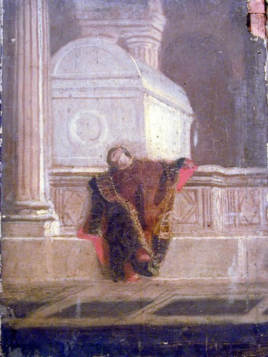 scène (homme, de face, assis, symbole : décadence, vêtement : à l'antique, colonne, Byzance, tombeau)