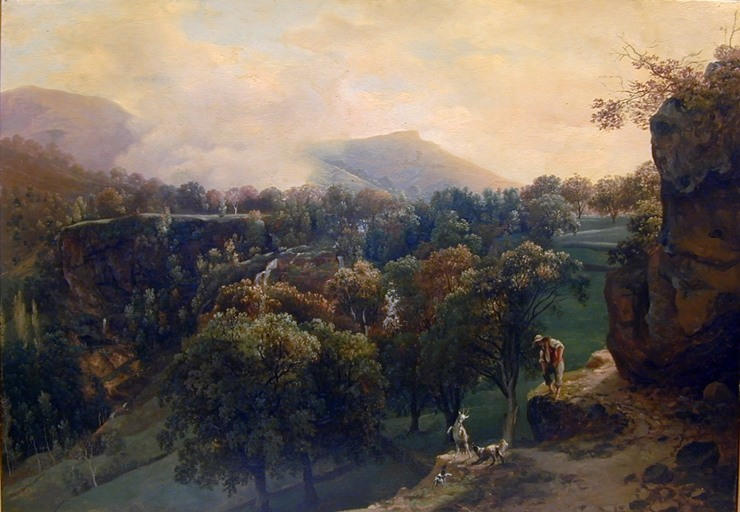 paysage (colline, forêt, cascade, nuage, chemin) ; scène (berger, chèvre, chien berger)