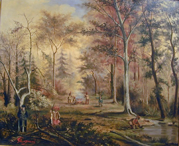 scène (groupe de figures, Cazeneuve Marius, Indien d'Amérique du nord, forêt, campement)