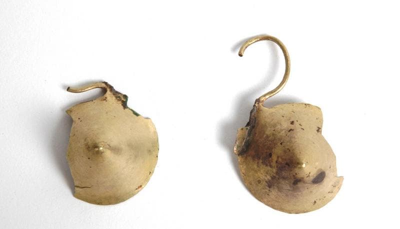 Élément de parure (?) à motif conique conique. Les pièces sont cassées au niveau d'une probable zone de soudure (partie centrale de l'objet). Système de suspension cassé composé d'un anneau de section circulaire.