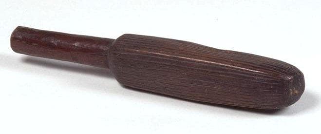 Battoir à section semi quadrangulaire. La surface est recouverte de stries parallèles sculptées dans le sens longitudinal