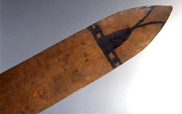 Bouclier de forme oblongue légèrement épointé aux deux extrémités. Décor géométrique peint en noir
