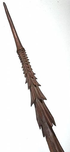 Lance dont le manche est à section transversale circulaire. La partie distale est sculptée à barbelures et se termine en pointe