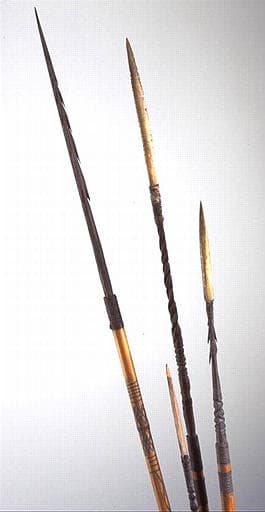 Quatre lances à réseaux de barbelures. Les lances c et d portent, également, un décor en vannerie (sparterie) coloré dans leur partie distale.