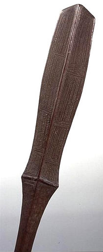 Massue dont le manche est à section transversale circulaire. La partie distale est en forme de palette étroite traversée longitudinalement par une nervure en relief sculptée. La palette est décorée de chaque côté de la nervure par une succession de motifs