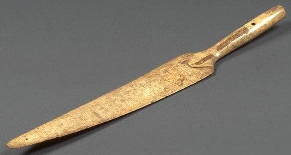 Palette courte et plate. Le manche est étroit et court, prolongé par une pelle de forme triangulaire. Le manche est percé.