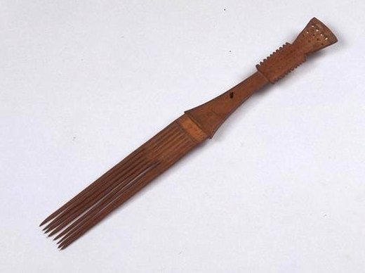 Peigne long et étroit à 13 (?) brins. La partie distale forme un rétrécissement prolongé par un motif bilatéral dentelé qui conduit à un autre motif sculpté en forme de trapèze