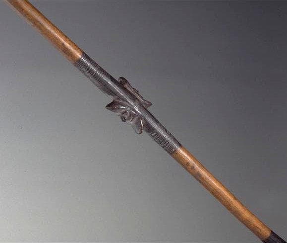 Sagaie dont le manche est à section transversale circulaire. La hampe est sculptée de deux têtes bifrons teintes en noir.
