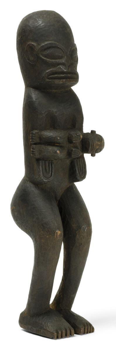 Personnage sculpté de sexe féminin (?) tenant horizontalement dans ses bras un autre petit personnage sculpté. Les pieds sont jointifs. Les traits sont sommairement ébauchés et la facture générale se rapproche de la production de type curios.