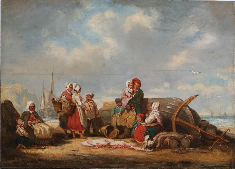 paysage (plage, marin pêcheur, famille, bateau, ancre, poisson, panier)
