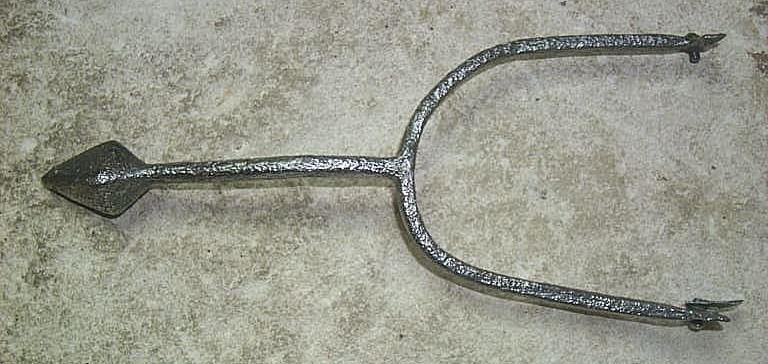 éperon à branches en U, pointe à pans coupés et à base tronconique, branches percées de deux oeillets à chaque extrémité