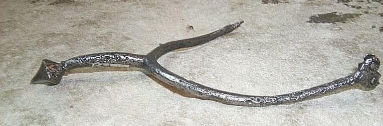 éperon à branches fines et incurvées. Système d'attache à rivets. Une branche brisée. Tige incurvée. Pointe fine à quatre pans coupés incurvés, base tronconique