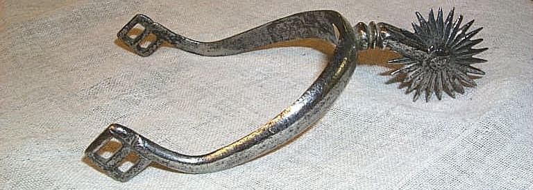 éperon à passants et branches en U à pans. Tige coudée. Molette à vingt-quatre pointes