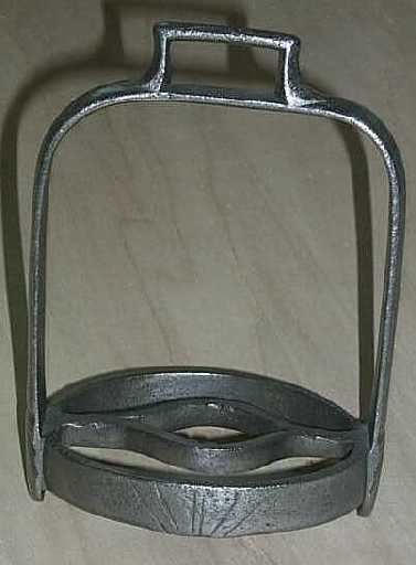 étrier à grille. Arceau en anse de panier. Branches s'élargissant vers le bas. Semelle ovale ajourée. Oeil rectangulaire