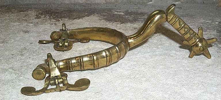 éperon à branche en U. Deux boutons d'attache. Deux boucles à aileron. Tige coudée. Molette à cinq pointes