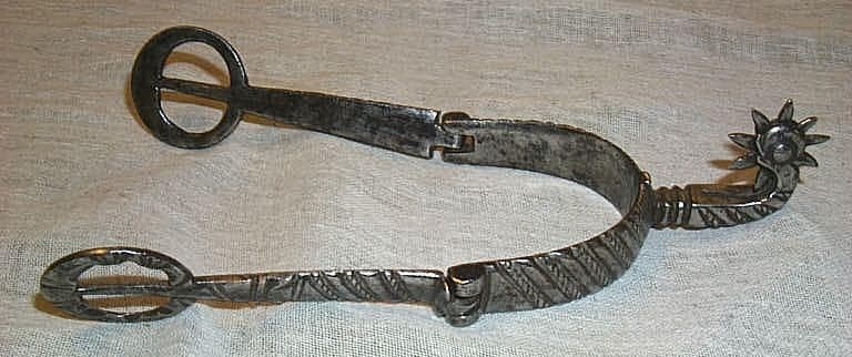 éperon à branches articulées et passants. Tige incurvée. Attache à décor de bague filetée. Molette à neuf pointes