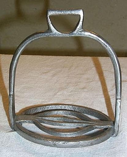 étrier à arceau. Branches à section circulaire aplaties à la base. Semelle ovale ajourée. Oeil semi-circulaire