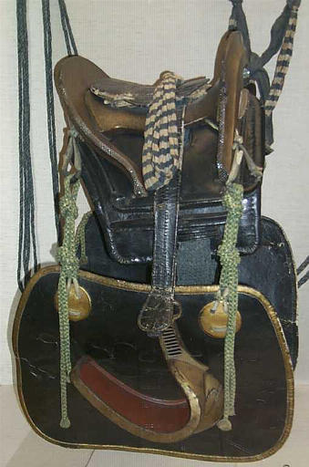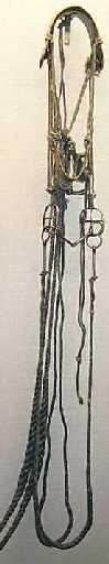 selle avec arçon composé de deux bandes et de deux arcades ; étrivières, étriers en forme de sabot ; caparaçon ; croupière ; bride avec dessus de tête, frontal, montants, mors de filet brisé ; rênes ; caveçon avec têtière et chanfrein ; longe