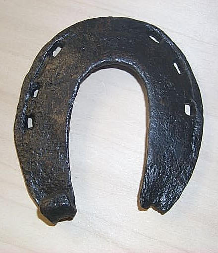 fer voûté pour pied plat ou comble ; un crampon recourbé ( un crampon manquant) ; six contreperçures rectangulaires ; un clou attenant