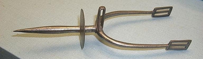 éperon à passants ; branches à section arrondie ; passant au talon ; tige à pointe munie d'une fine rondelle