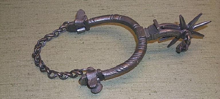 éperon à branches à section arrondie ; boutons, chaînette, sous-pied ; tige incurvée ; sonnailles ; molette à huit pointes