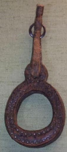 étrier indien circulaire formé de plusieurs épaisseurs de cuir clouté ; une bande de cuir portant un anneau est fixée à l'oeil surmontant l'étrier indien
