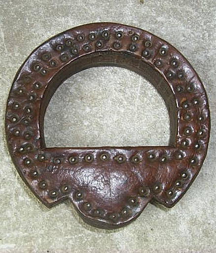 étrier semi-circulaire à saillie formé de plusieurs épaisseurs de cuir clouté