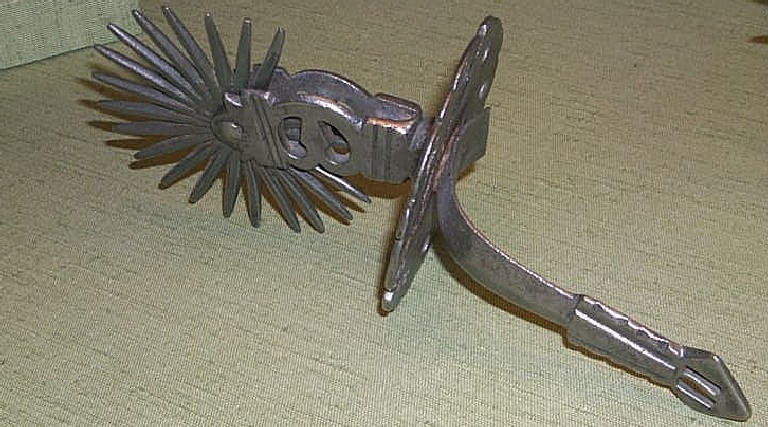 éperon à passants, rondelle et tige ajourées, grande molette à 20 pointes ; une branche manque