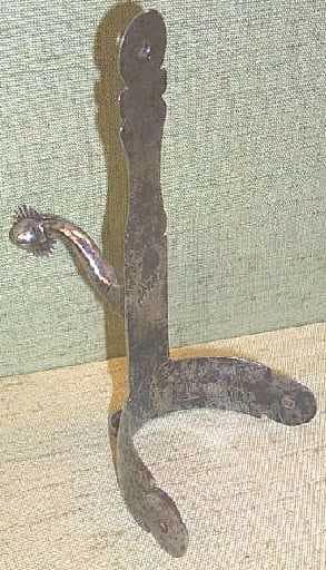 éperon pour houseau ; branches avec trous pour rivets, talon surélevé pour prolonger l'appui ; tige incurvée, molette à vingt-deux pointes