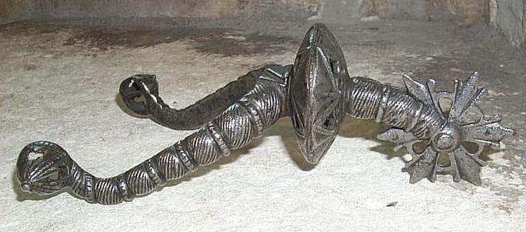 éperon à branches en U. Calotte pointue ajourée formant passant à l'extrémité de chaque branche. Rondelle ajourée à l'attache de la tige. Molette en forme de rosace ajourée à six pétales
