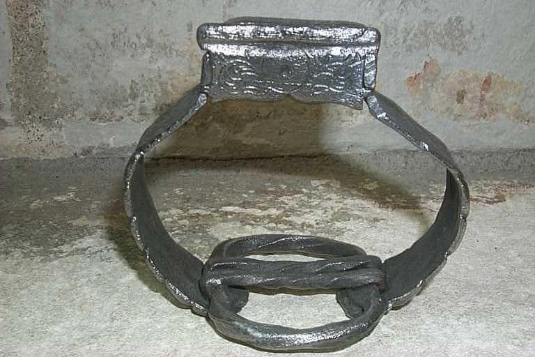 étrier à suspension excentrique. Arceau arrondi . Branches plates s'élargissant vers le bas. Semelle circulaire évidée à deux barrettes
