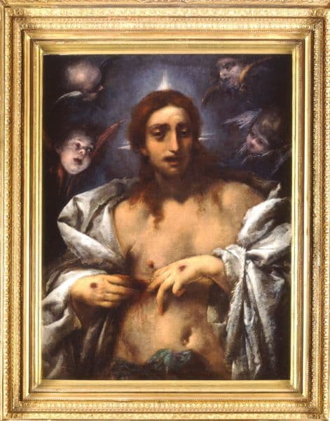 Le Christ montre l'intérieur de sa plaie conformément à la demande de Thomas. Les signes de sa passion sont évidents : la nudité, les stigmates, la croix de lumière, le linge mortuaire. Les anges représentés montrent que Jésus est une apparition (qu'il fait partie du monde spirituel). Thomas a besoin de preuves pour croire à la résurrection. La toile de Soissons représente le Christ mettant en évidence ces preuves. Comme nous l'avons déjà fait remarquer Saint Thomas n'est pas représenté, sa présence est implicite et la spectateur s'identifie à l'apôtre qui ne croit pas sans avoir vu. Le Christ est représenté à mi-corps, jusqu'au bassin, et de face. Le regard dirigé vers le spectateur il porte ses mains à son flanc droit percé. Il enfonce deux des doigts de sa main gauche dans sa plaie tandis qu'avec l'autre, la main droite, il montre le geste qu'il est en train de faire avec la gauche. L'artiste a représenté les deux mains du Christ de façon à ce que les plaies causées par les clous de la crucifixion soit bien visibles . Représenté nu sous une étoffe épaisse de couleur grise qui lui sert de manteau (peut-être le linge mortuaire), ses cheveux sont longs et bouclés. Un linge vert foncé lui cache le bas ventre. Ceint autour du ventre, ce linge rappelle le perisonium que porte le Christ en croix et par conséquent renvoie au moment où le Christ reçut sa plaie au flanc droit. La tête du Christ est auréolée par un nimbe formé de trois rayons de lumière discrets. Ce nimbe - représenté sous la forme d'une croix de lumière -, la nudité, les stigmates et peut-être le linge mortuaire, représentent les signes évidents de la Passion du Christ. Autour, de part et d'autre, quatre chérubins (deux de chaque côté) virevoltent. Ces derniers appartiennent au deuxième chur dans la première hiérarchie des anges, ils sont représentés sous l'aspect d'une tête ou d'un buste d'enfant porté par deux ailes : iconographie respectée par Cecco Bravo dans la toile du musée de Soissons.